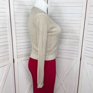 MNG Mango Pointelle Metallic Shimmer Button Up Cardigan Sweater Tan Gold Large