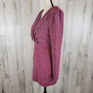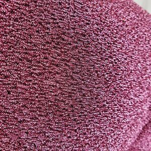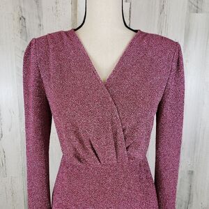 ~ Description: Pink metallic material, stretchy, long sleeves, pleated shoulder, unlined, surplice neckline, shoulder pads