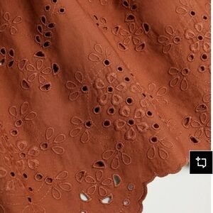Chic terracotta dress with puff sleeves. Features eyelet hem. Ideal for versatile styling.