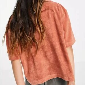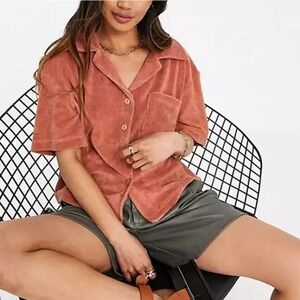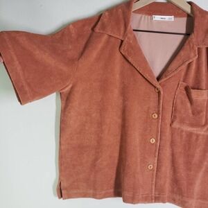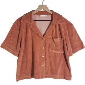 MNG Terrycloth Short Sleeve Shirt Button Front S Coral Oversized Relaxed Fit
