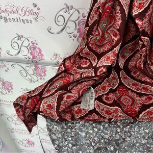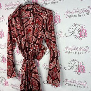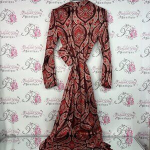 Elegant long kimono cardigan with a paisley pattern. Features a tie waist and flowing sleeves. Perfect for lounging in style. USA 4.