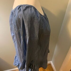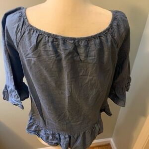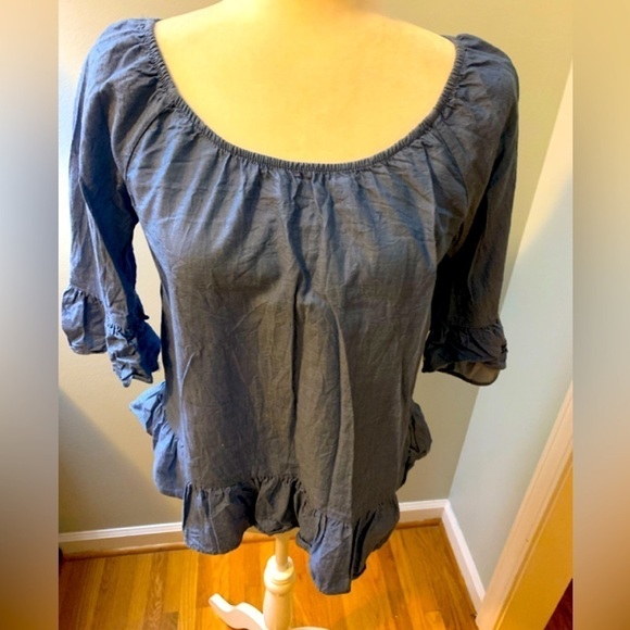 MNK blue chambray top with elastic neckline and 3/4 sleeves..ruffle at hemline..gently used……fabric feels so soft..size M..