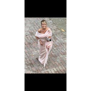 This elegant MNM Couture gown features a sophisticated off-shoulder design, dramatic floral ruffle accents, and a high slit, making it a stunning choice for evening wear. Its soft pink hue and fitted silhouette exude timeless charm and femininity.