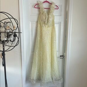 Charming butter yellow dress with shimmering sequins. This is the color of the year!! Ruffle neckline adds elegance. Ideal for formal events. Pet free smoke free home!