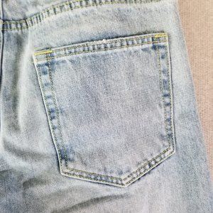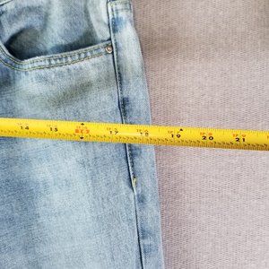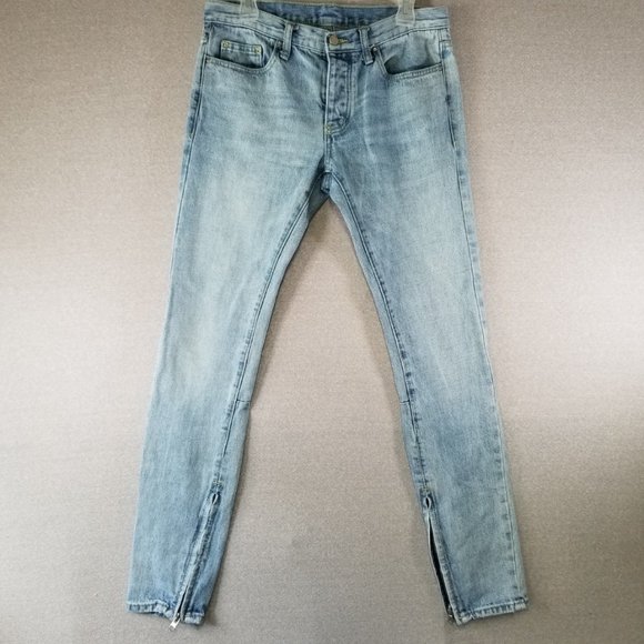 Pre-owned, 1 small mark on the button (see pictures), Light Wash, Athletic Skinny Jeans, 100% cotton. Features zipper on bottom of legs.