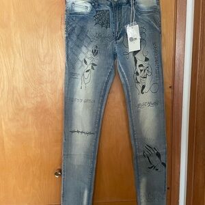 Bold graphics on blue denim. Unique style with artistic flair. Progressive silhouette, straight leg fit. Incredible art to wear & messaging. Perfect for a standout look.