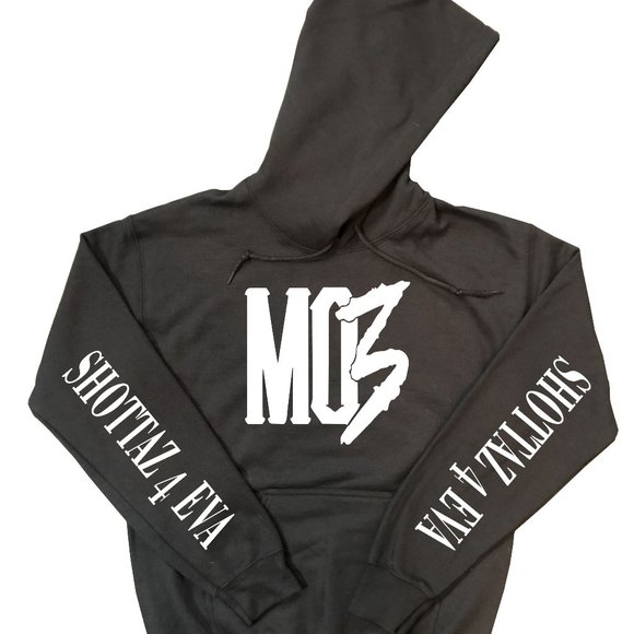 This is the MO3 Hoodie with MO3 Design on the Front and "Shottaz 4 Eva" on the Sleeves on a Black Hoodie with White Designs.