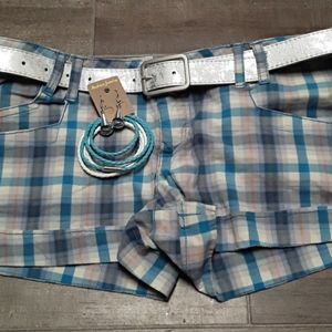 MULTI COLORED SHORT IN SHADES / TONES OF BLUE WITH A HINT OF SOFT ORANGE,SLIGHTLY OFF WHITE. WAIST IS MID/LOW RISE, TAGGED AS A MEDIUM WAIST MEASURES 34 THIS IS LOW RISE BUT RUNS BIG. WAISTBAND IS SLIGHTLY OVER 1 IN WIDE BUTTON FRONT CLOSURE. DOUBLE BELT LOOPS IN FRONT AND MIDDLE OF BACK WAISTBAND. REINFORCED AT STRESS POINTS.TOP STICH DETSILING THROUGHOUT GARMENT. RISE IS 8" LENGTH IS 3". FAUX CUFF WITH TOP STICH DETAILING. WORKING BACK POCKETS WITH BUTTON FLAP CLOSURES. ACCESSORIES TOO!