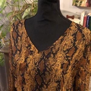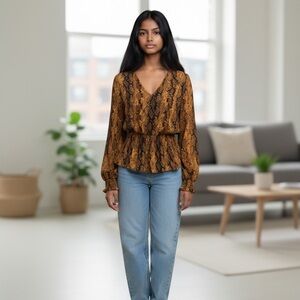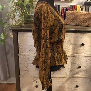 MOA MOA PEPLUM STYLE SEMI SHEER SNAKESKIN PRINT SMOCKED BLOUSE BROWN BLK SIZE M