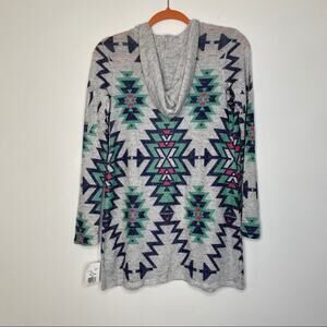 Colorful tribal pattern throughout. Light grey with navy, aqua, Fuschia. Soft and lightweight. Super stretchy material. Fabric content is 72% polyester, and 23% rayon, and 5% spandex. Made in USA. Measurements are as follows: 34 inches around, sleeves are 24.5 inches in length 28 inches in length. All measurements are approximate and take while lying flat.