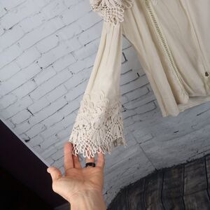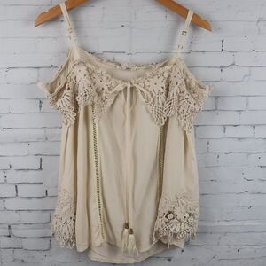 CREAM COLD SHOULDER LONG SLEEVE BOHO TOP WITH LACE & TASSEL DETAIL ADJUSTABLE STRAPS SIZE MEDIUM PRE OWNED NO FLAWS
