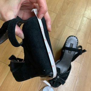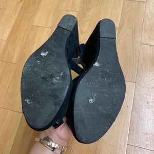 M.O.D. Black suede platform wedges | adjustable ankle strap | flower detail on toe | open toe | size 7 | heel height is 4.5” | length of platform in front is .75”
