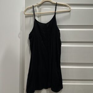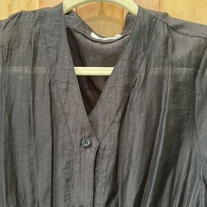 Black linen button up with lining underneath that has adjustable straps