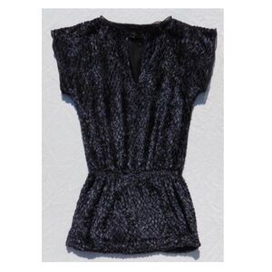 Adorable blouson-style mini dress/tunic top by MODA INTERNATIONAL (Victoria’s Secret). Features a stretchy elasticized waist, short sleeves, full lining and keyhole neck with tie. Black with navy blue velvet burnout.