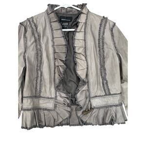 Elegant and romantic, this MODA International jacket features a lustrous silvery gray satin finish with ruffle trim detailing along the collar, front placket, hem, and cuffs. It has a structured yet feminine silhouette with pleated accents and tonal stitching that give it a Victorian-inspired look. The cropped cut flatters the waist, and the lightweight satin-like fabric makes it perfect for layering over camis, blouses, or dresses.