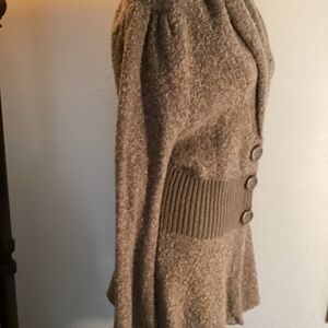 Longer three front button long baggy sleeve sweater. Nice fitted waist with a longer billowing sleeve. V neck front with big folding collar.