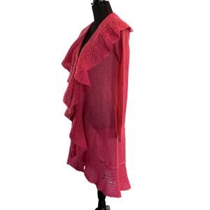 MODA International Mohair Blend Cardigan Sweater Duster, Dusty Rose Collar, Crochet Trim, Hook/Eye Close, Open Knit Trim...Ruffle/Collar/Border