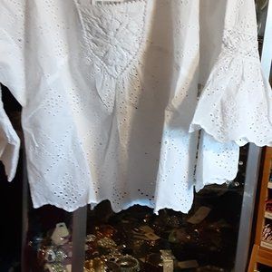 FROM MODA POSA WHITE ALL COTTON EYELET TOP NWTS WAIST LENGHT V NECK WITH FRILLY SLEEVE FROM OUR BOUTIQUE GLITZ 180 DANIELSON PIKE SCITUATE RI 02857