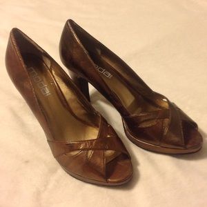 MODA Spana Bronze Metallic heels. Never been worn, but have small defect on inside of shoe (see 3rd pic) which is why I'm not listing as NWOB. Cannot tell when wearing shoe, as it is on the inside.