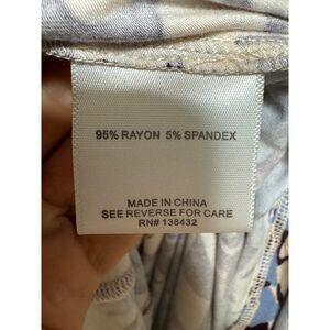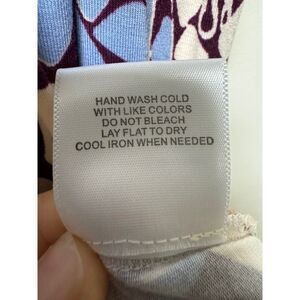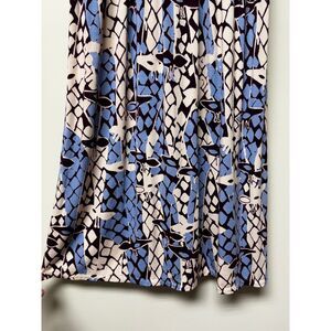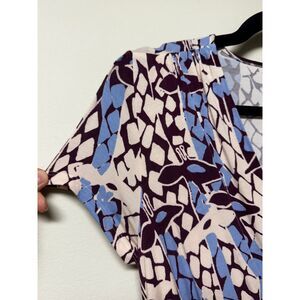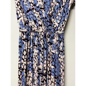 Burgundy, blue and cream giraffe novelty print in a faux wrap design. Short sleeves with elastic waist. Midi length. Stretch jersey knit, super comfortable.
