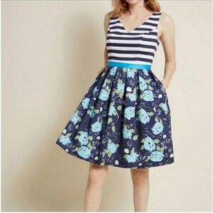 MODCLOTH Fit n Flare Striped Floral Blue Dress