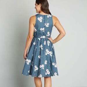 Set your day off to a spirited start by slipping into this vivacious, teal faux-wrap dress! Boasting a nautical stripe-and-daisies print which was created by our ModCloth label designers, and crafted from breathable cotton for all-day comfort, this sash-tied fit-and-flare always brings an enthusiastic smile to your face. Find us wearing this surplice number with our peep-toe heels and dangly earrings to parties, dates, and other daytime events.