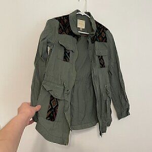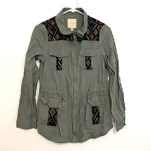 MODCLOTH Keep a Woven Mind Jacket Olive Army Green Multi Aztec Boho Embroidered