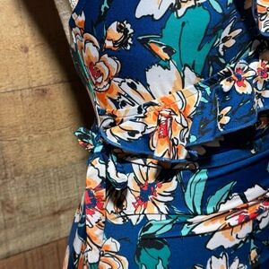 MODCLOTH the Reese one-piece swimsuit in a blue and multicolored floral print. Swimsuit has no size tag but seems to be an XS. Please see flat lay measurements to ensure fit. Pre-loved great condition. This one-piece swimsuit embodies sweetness and femininity. With ruffles cascading from the halter straps through the surplice neckline, a waist-cinching tie, this blue and floral print suit makes waves anywhere it’s worn.