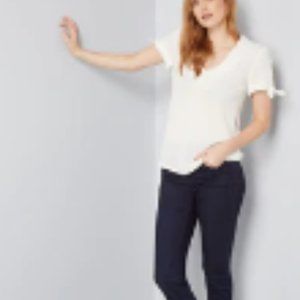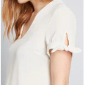Features: v-neck, ideal discovery short sleeve blouse, white blouse, bows on sleeves, short sleeve detail, NWOT, brand new