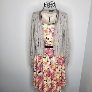 Frock Shop dress from Modcloth. Floral pattern with a tie waist and pockets. Zips up the side. Fully lined. Would look adorable paired with a cardigan as shown in the last photo.