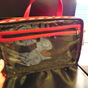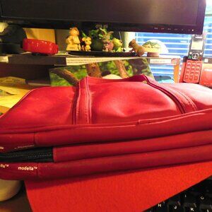 Beautiful red makeup bag from MODELLA - with black gun metal opening zipper. One large fully zippered inside compartment and another full clear see-thru side zipper. Measures 12" x 8". 11" including handle.