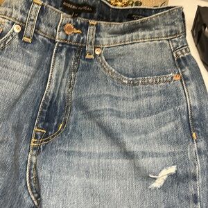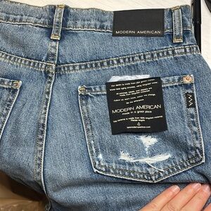 Modern American is a Fidelity Denim Sustainable Diffusion Line carried at Anthropologie and other points of sale. Wider leg, relaxed, USA grown cotton, with intentional distressed knees. NWT. On trend and perfect for so many fits.