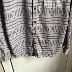Washable cotton for a flannel feel with a light grey geometric print, foldover collar, button up, left chest pocket, long sleeves with button cuffs. Excellent condition. Size large, measures 23” from armpit to armpit and 28” from top of shoulder to bottom hem.