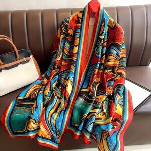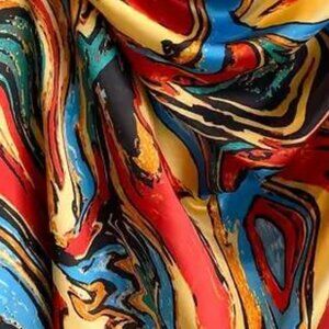 New in original packaging. Looks like a modern art oil painting in fabric. Colorful, long scarf will go with any shade you choose to wear! Polyester with a satin feel. Measures approximately 71" X 32".