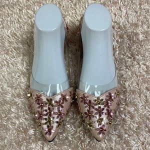 These flats (there is a very small heel, less than 1") are simply gorgeous. The toe box and heel are a lovely shimmery pink color and there are 3 dimensional flowers attached in a darker pink and gold color. There is a clear part of the shoe that is meant to assist in keeping them securely on your feet. These are European size 39 which is roughly a size 8 women's.