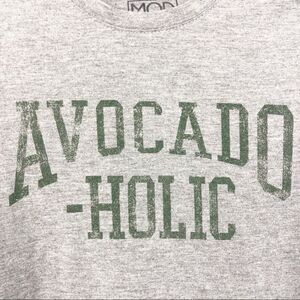 Obsessed with Avocado?? Join the club! Gray short sleeve tee with green graphic that says Avocado-Holic. Solid back. Tiny hole on the bottom side as shown in the last 2 photos. Otherwise great preowned condition!! Ladies size XS.