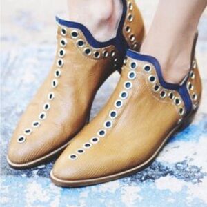 MODERN VICE NYC premium handmade leather shoe made for Free People. Rivet metal eyelet details- very trending with cool gold metallic interior. Textured leather exterior in neutral cognac trimmed in black. Gold shoe is pic stock EU size 36** fits 5-6. About 9.5” toe-heel