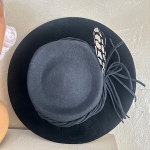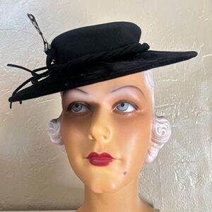 This is a stunning tilt hat from the 1930's. The flat crown is indented around the top. edge, and is surrounded by a velvet covered brim. There is a band made of twisted narrow felt strips around the brown, which ends in a bow and "streamers" at one side. Stunning painted feathers in off-white and black rise above the hat from the side where the bow is located. These feathers are very delicate, and are in expected vintage condition. There are 2 grosgrain bands attached to the inside of the hat, held together by a small elastic "O" ring. This band helps keep the hat in a tilted position.