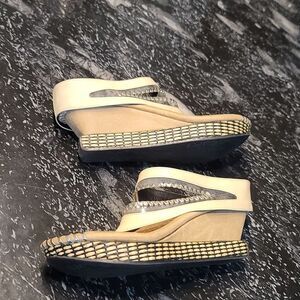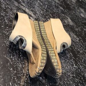 MODZORI WOMEN'S VALENCIA REVERSIBLE VEGAN WEDGE FLIPS SANDAL  SIZE 11 COLOR BEIGE &BLACK technology offers multiple styles in one pair of shoes easily flip the upper piece of each shoe to change the design, color, and pattern. All styles and proprietary concepts are designed by fashion icon Yelena Shmurak, with more than two decades of experience as a leader in the fashion industry.Modzori shoes are designed to mold to your foot. At first, you may experience a snug fit, but your shoe will quickly adapt to your individual foot shape. The flexible upper and comfort details built into the footbed make Modzori shoes easy to wear all day.Modzori shoes are versatile and ideal for travel; just pack one pair of convertible shoes, made to match every outfit. We are proud to share Modzori shoes are cruelty-free, crafted with vegan leather and handmade using natural materials. Shoe height heel-1.5"3.81 cm & platform 5” 1.27 cm Step out in style with these chic wedge sandals. Featuring a sleek black and tan design, these shoes are perfect for any occasion. Enjoy comfort and elegance with every step.Designed with a comfortable mid wedge, these sandals offer the perfect balance of height and stability ensuring all-day comfort without sacrificing on the go.Modzori Women’s Valencia Reversible Vegan Wedge THIS ITEMS IS PRE-OWNED WITH ONLY LIGHT SIGNS OF WEAR IF ANY CHECK THE PICTURES