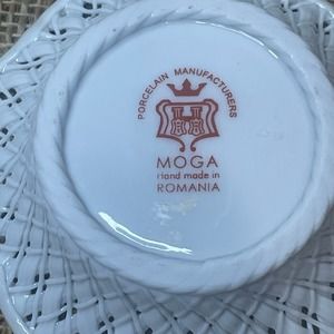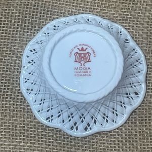 MOGA Handmade in Romania Floral Pattern Ring Trinket Dish in good preowned condition. No chips, cracks, or crazing. Small size. Some light wear to bottom of dish as well as some sticker residue on the bottom. Measures 3.75" across and stands 1.25" tall.