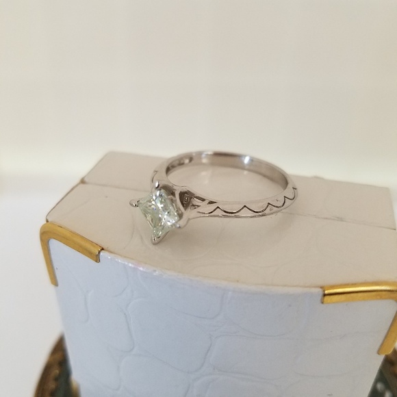 This is a genuine Moissanite solitaire engagement ring. This stone is the modern alternative to diamonds for newlyweds. It looks and tests like a diamond on some diamond testers. It is at least 1ct princess cut. May be 1.5 cts. It is set in sterling silver