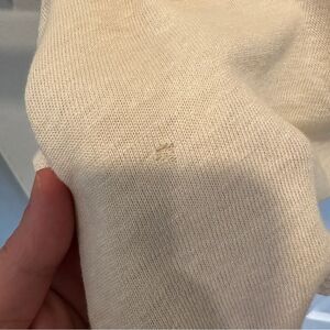 This is pre-loved, and in good condition. Small hole in the back, by the "flare out" section, and a pin hole sized stain. Gently laundered/dry cleaned typically.