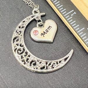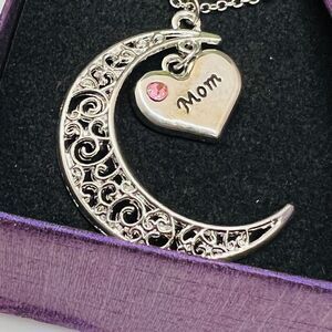 MOM Filigree Crescent Moon Heart Necklace Mother Birthday Mothersday Gift Silver Tone Pink Stone.