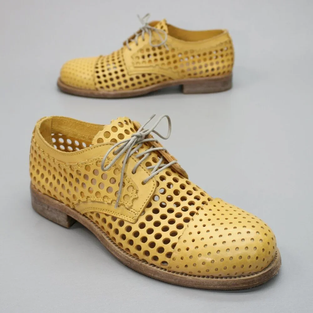 A pair of Italian women's MOMA Giallo Yellow Golden Maze cutouts leather lace-up perforated derbys made in Italy