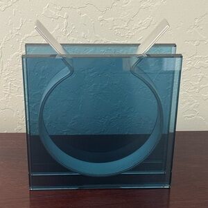 MOMA Square Ribbon Vase in hard to find blue glass. TYPE Vases SIZE Square: 7.75h x 6.75w x 1.75"d. MATERIALS Anodized Aluminum,