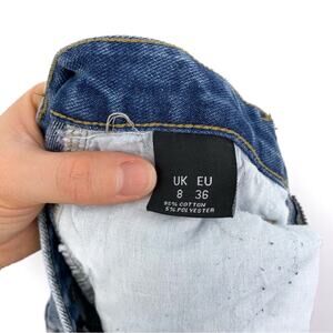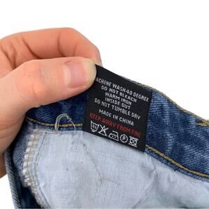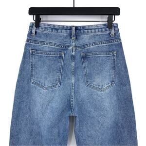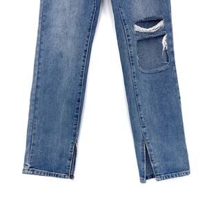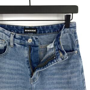 Momokrom Straight Leg Jeans in a medium blue wash. Zipper fly closure, not stretchy, straight slim leg with a inner ankle slit. Large knee hole distressing.