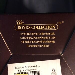 Boyd’s Bears and Friends Domestica T. whirlwind Collectable. Included box and certificate of authenticity. Has never been on display and kept in box. Box has some wear as shown in pics but item is pristine and never used. B-#3