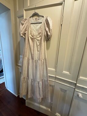 Elegant cream maxi dress with puff sleeves and a feminine tie-front detail. Lightweight fabric and tiered skirt create soft movement. Ideal for daytime events and casual outings. Cream color pairs easily with neutrals and gold accessories.