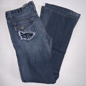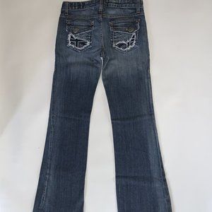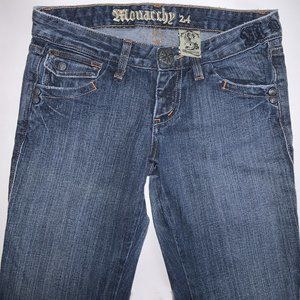 MONARCHY WOMENS SIZE 24 DISTRESSED FLARED BLUE JEANS WITH FANCY BUTTONS