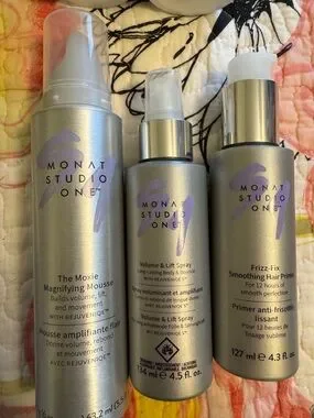 MONAT Studio One CC Cream, Flexible Hold Gel, moxie magnifying mousse, volume and lift spray, and frizz fix smoothing hair primer.